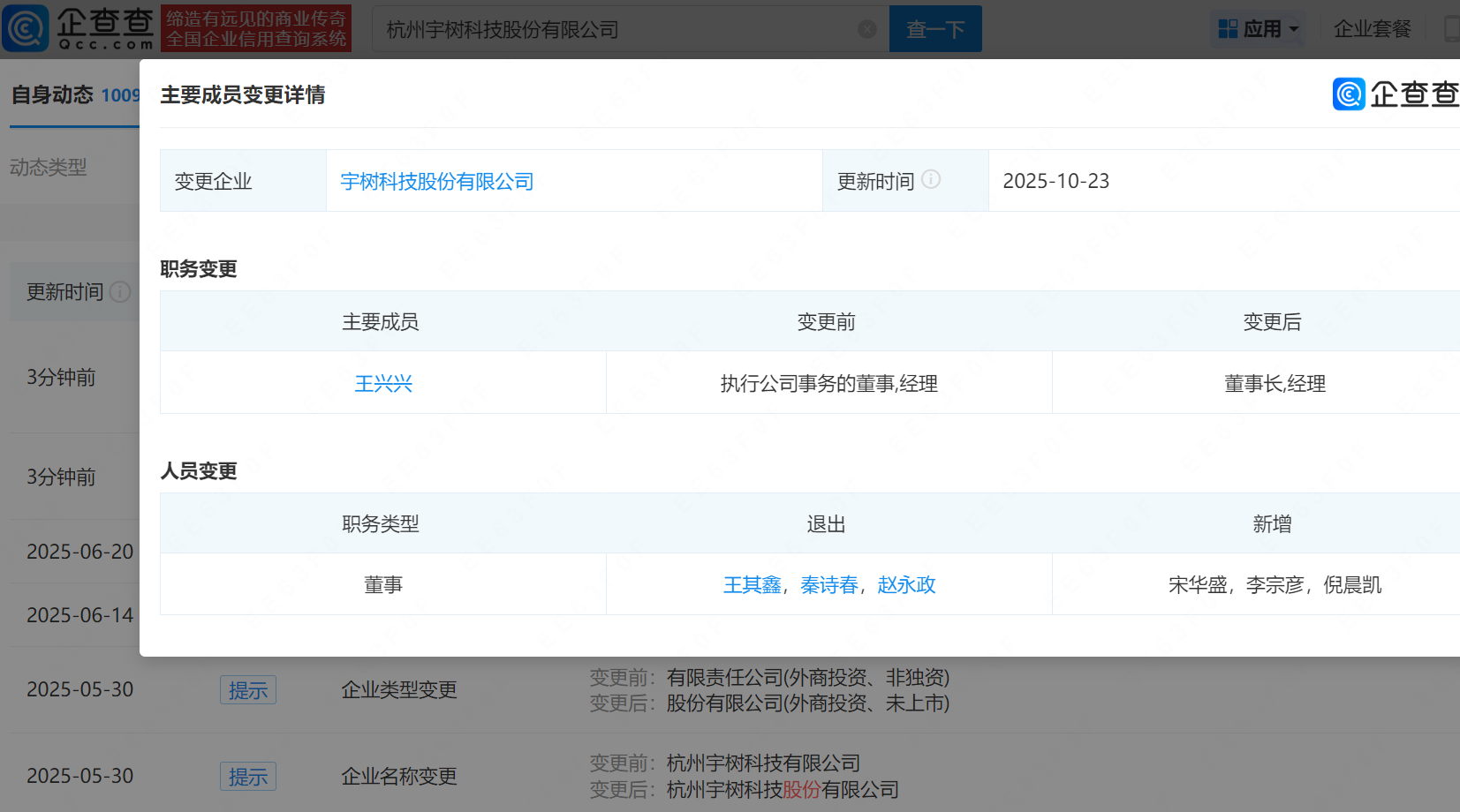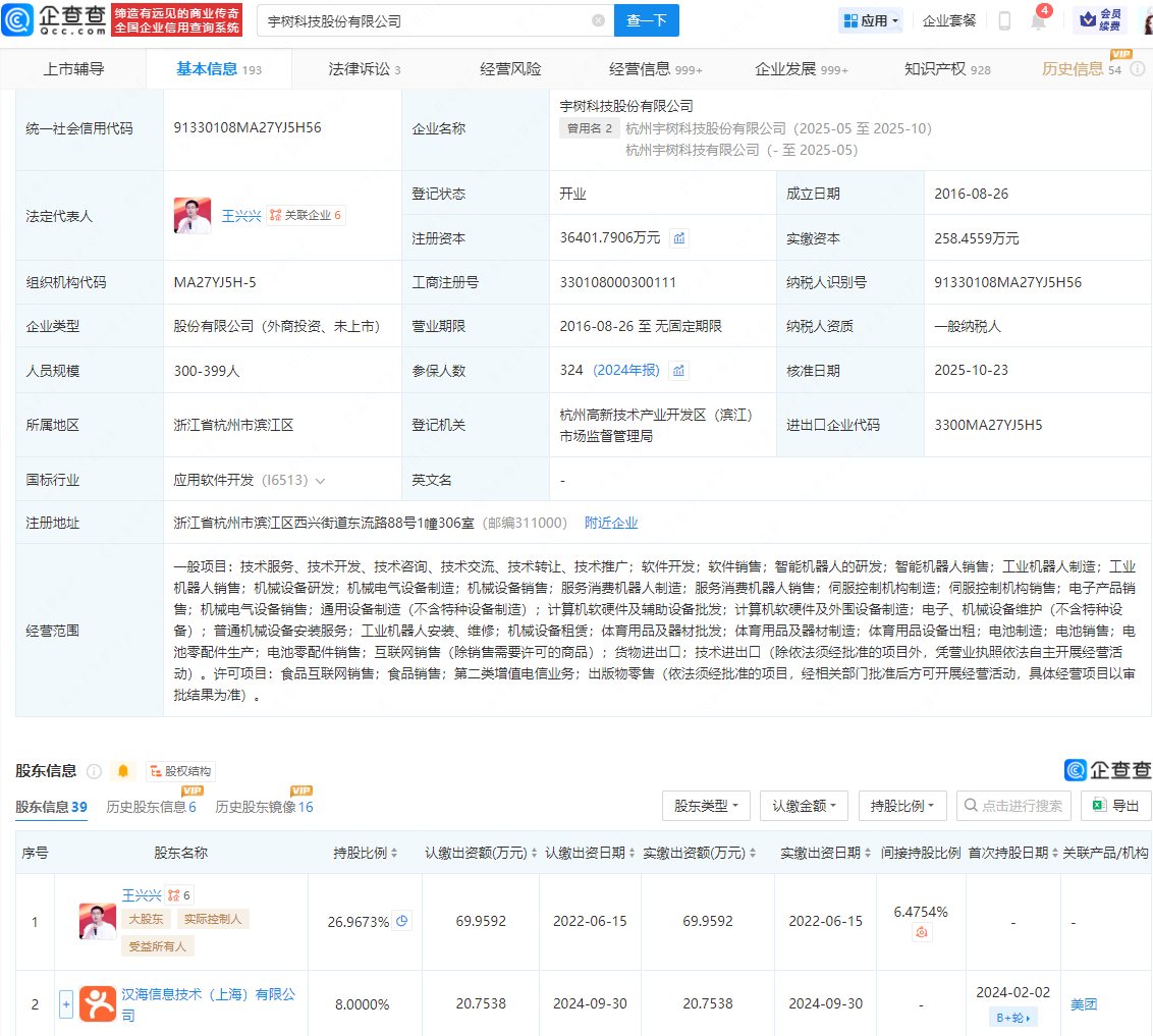 10月23日,杭州宇树科技股份有限公司发生工商变更,企业名称变更为宇树科技股份有限公司,同时王兴兴由执行公司事务的董事变更为董事长。企查查信息显示,该公司成立于2016年8月,法定代表人为王兴兴,注册资本约3.64亿人民币,经营范围包含智能机器人的研发、智能机器人销售、工业机器人制造等,由王兴兴、汉海信息技术(上海)有限公司等共同持股。据媒体报道,宇树科技IPO辅导机构中信证券近日提交了“辅导工作进展情况报告(第一期)”。报告透露,宇树科技2025年第五次临时股东会审议通过了《关于公司更名的议案》炒股平台入配资平台,决定公司更名为“宇树科技股份有限公司”。